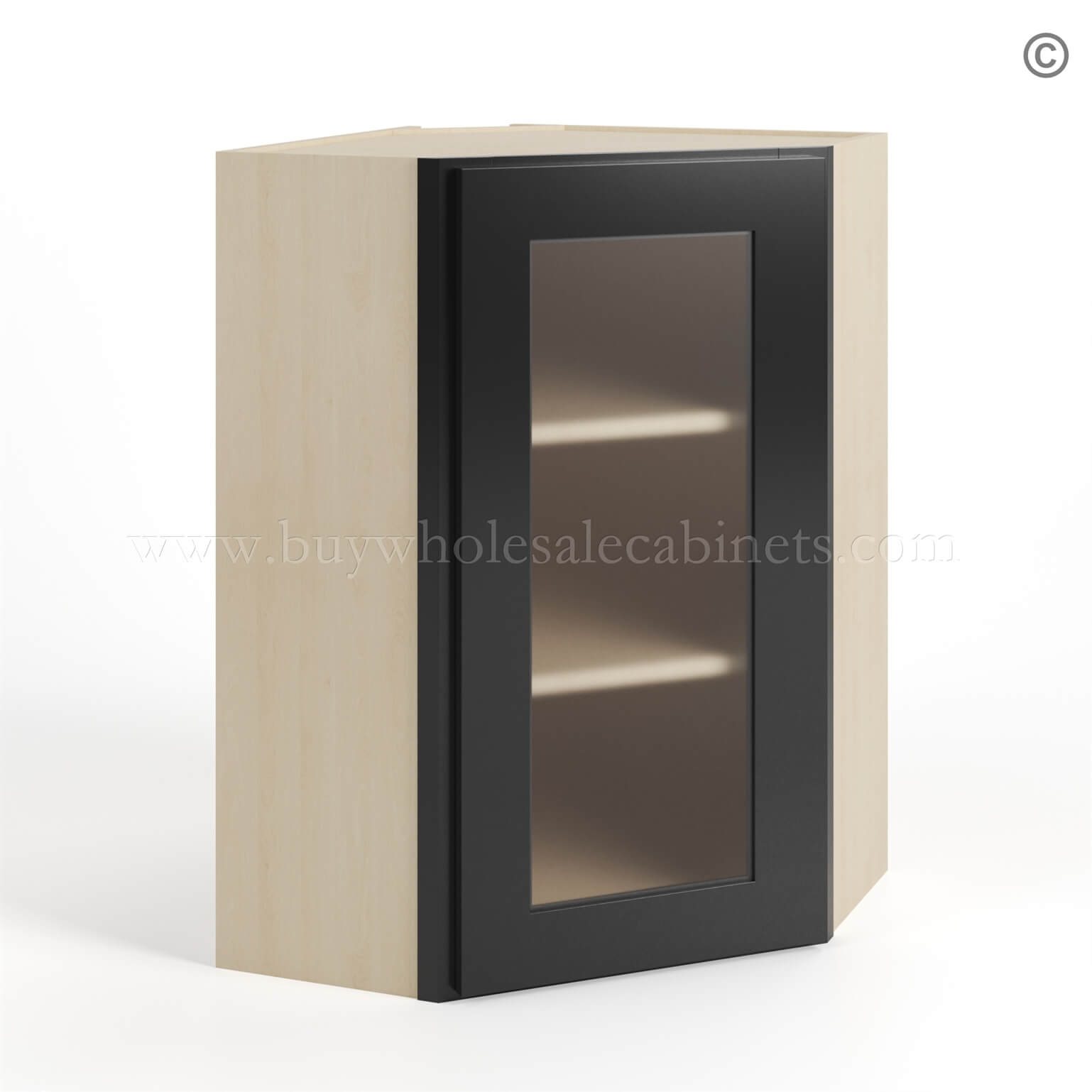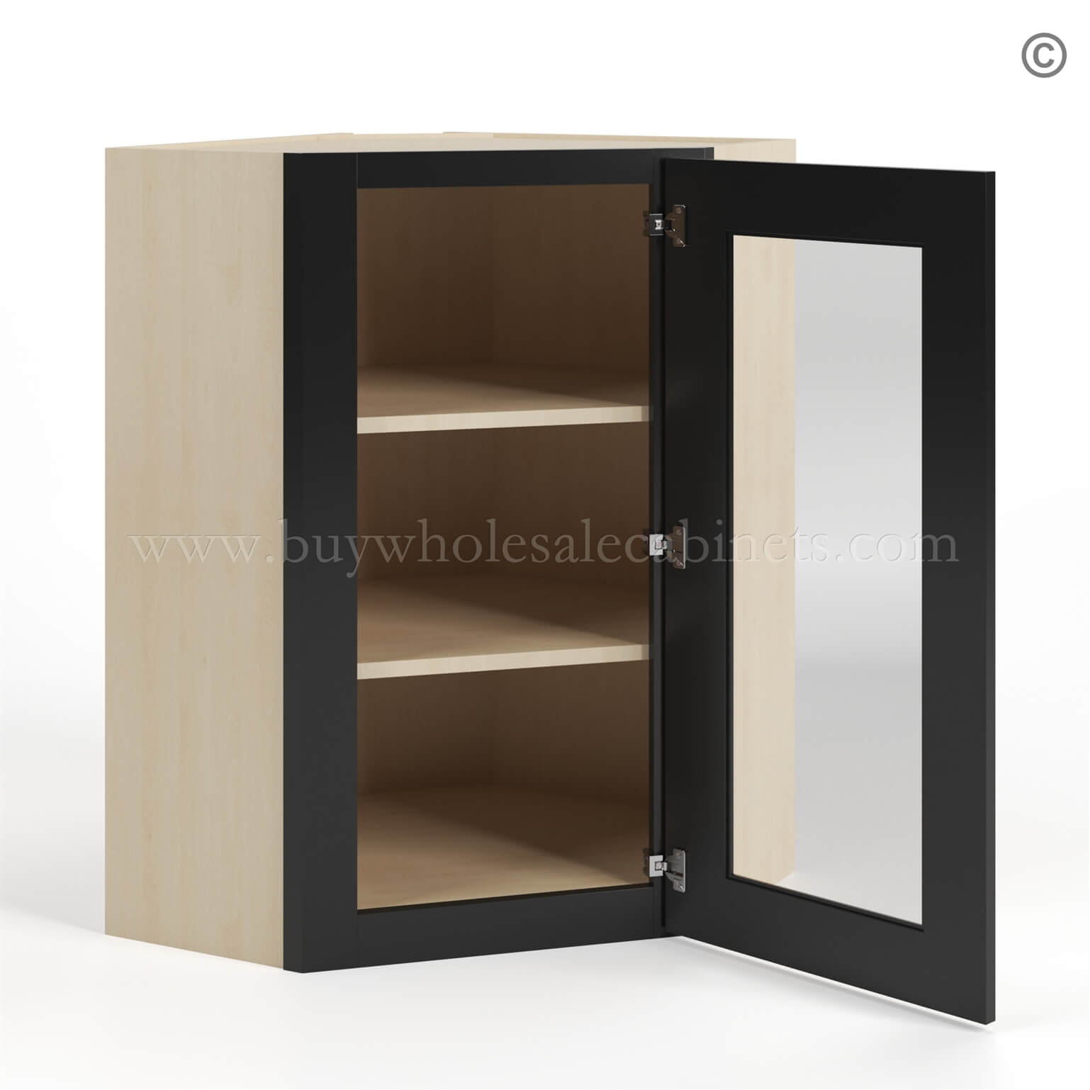 Our Black Shaker 24 Diagonal Corner Wall Cabinet with Glass Door is 24″ wide, 24″ deep, and available in 3 heights – 30″, 36″, and 42″. This Black cabinet will fit perfectly in your kitchen or bathroom.