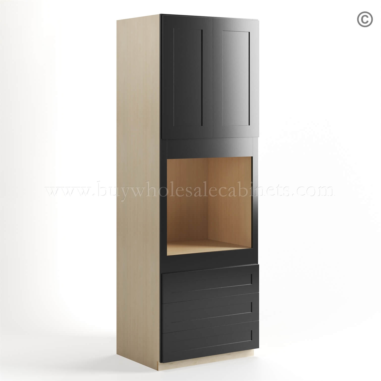 Our Black Shaker 30 W Oven Pantry Cabinet is 30″ Wide, 24″ Deep, and available in 3 heights. This cabinet features two doors, one large open shelf, and three bottom drawers. This cabinet Black will fit perfectly in your kitchen or bathroom. The brilliant shade of shaker Black cabinet will make your rooms exude modernity and quality.