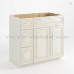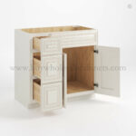 Our Charleston White Raised Panel 36 W Vanity Combo with Drawers is 34.5″ tall, 21″ deep, and 36″ wide.