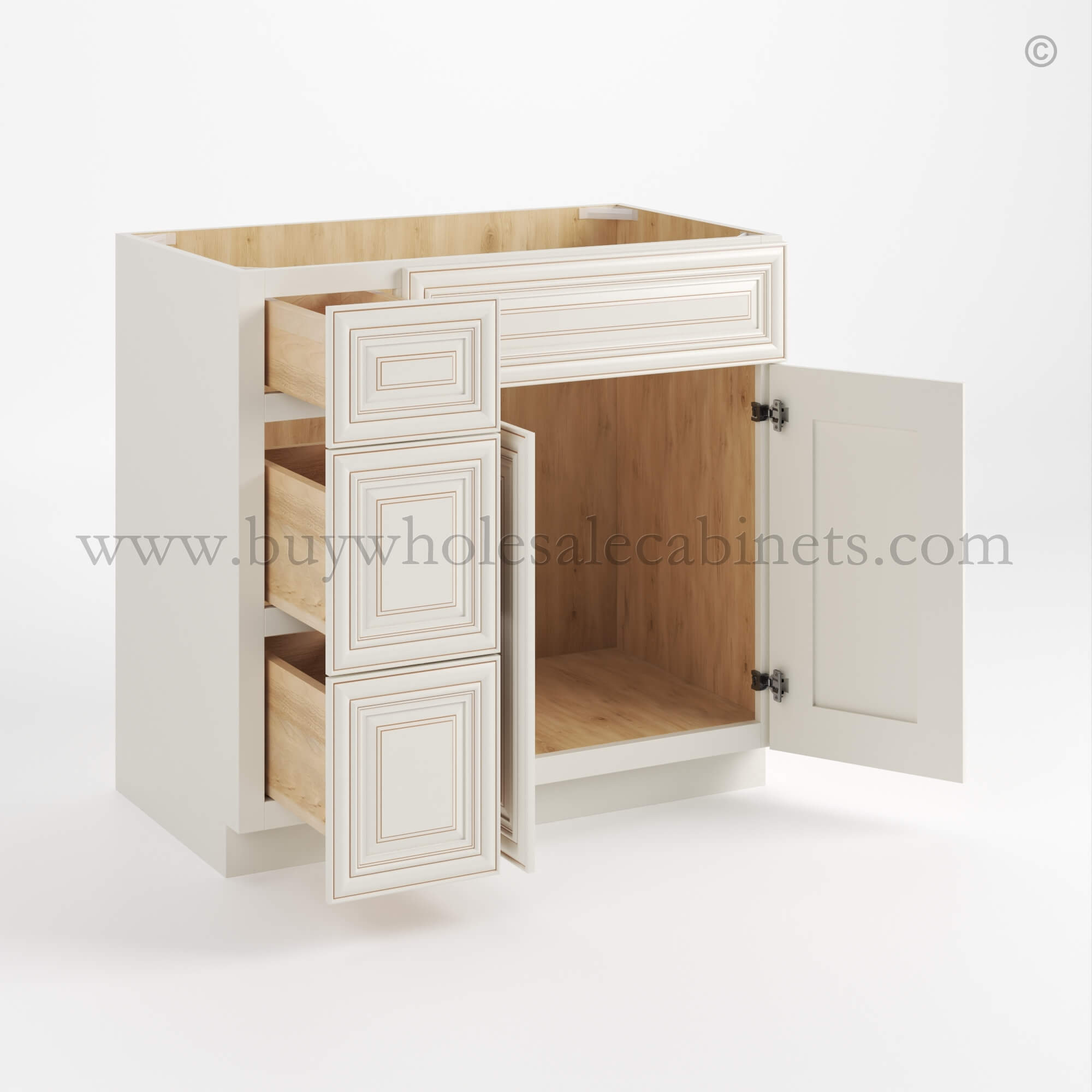 Designed for your convenience, this Raised Panel Charleston White vanity cabinet features European soft-close hinges on it’s single door, ensuring smooth and quiet operation every time, and European soft-close full extension glides on it’s three drawers. This cabinet also includes one false drawer maintaining the cabinet’s aesthetic appeal while providing necessary clearance for your sink.