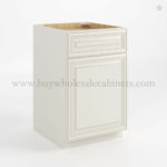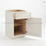 Our Charleston White Raised Panel Base Cabinet with Single Door & Drawer is 34.5″ tall, 24″ long, and available in 4 widths (12″, 15″, 18″, 21″).