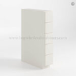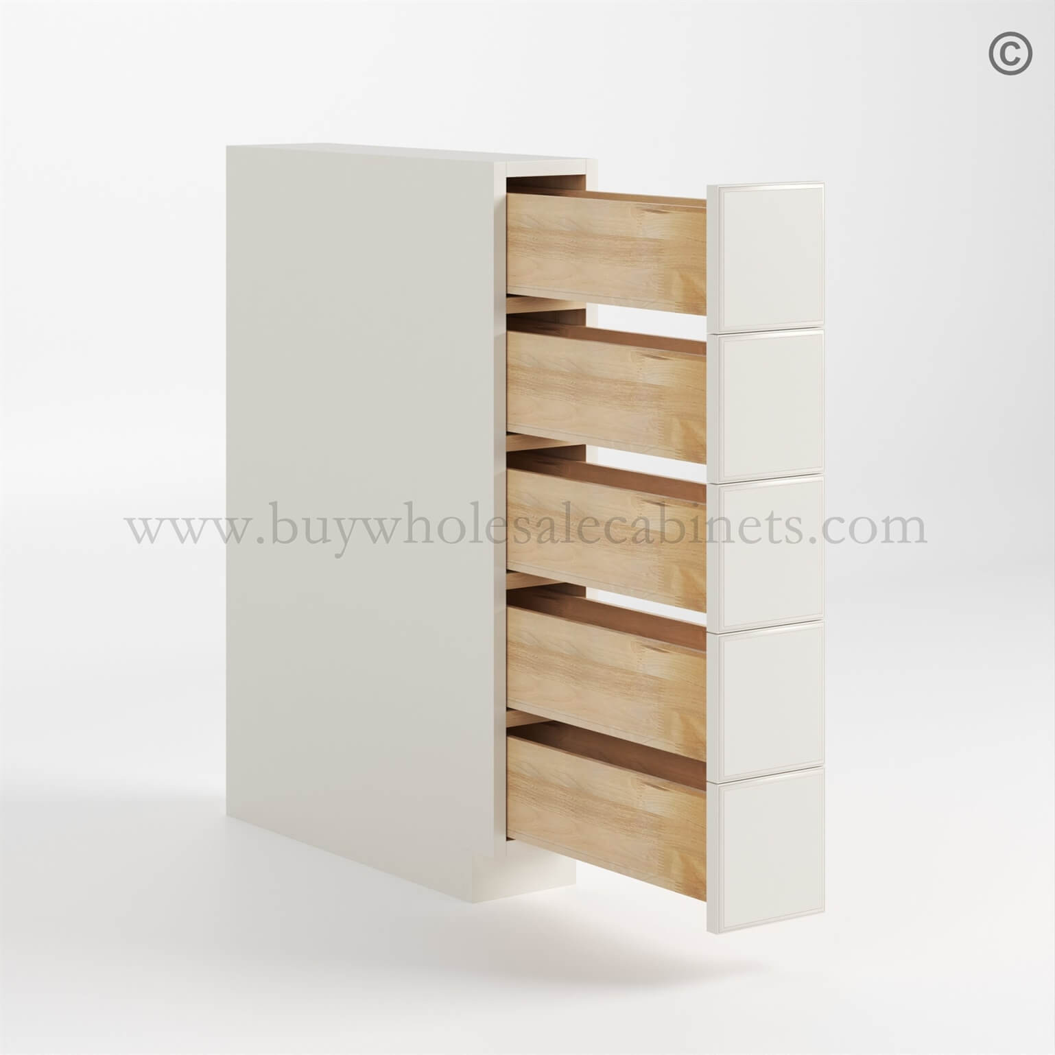 Our Charleston White Raised Panel Base Spice Cabinet with 5 Drawers is 6″ wide, 34.5″ tall, and 24″ deep.