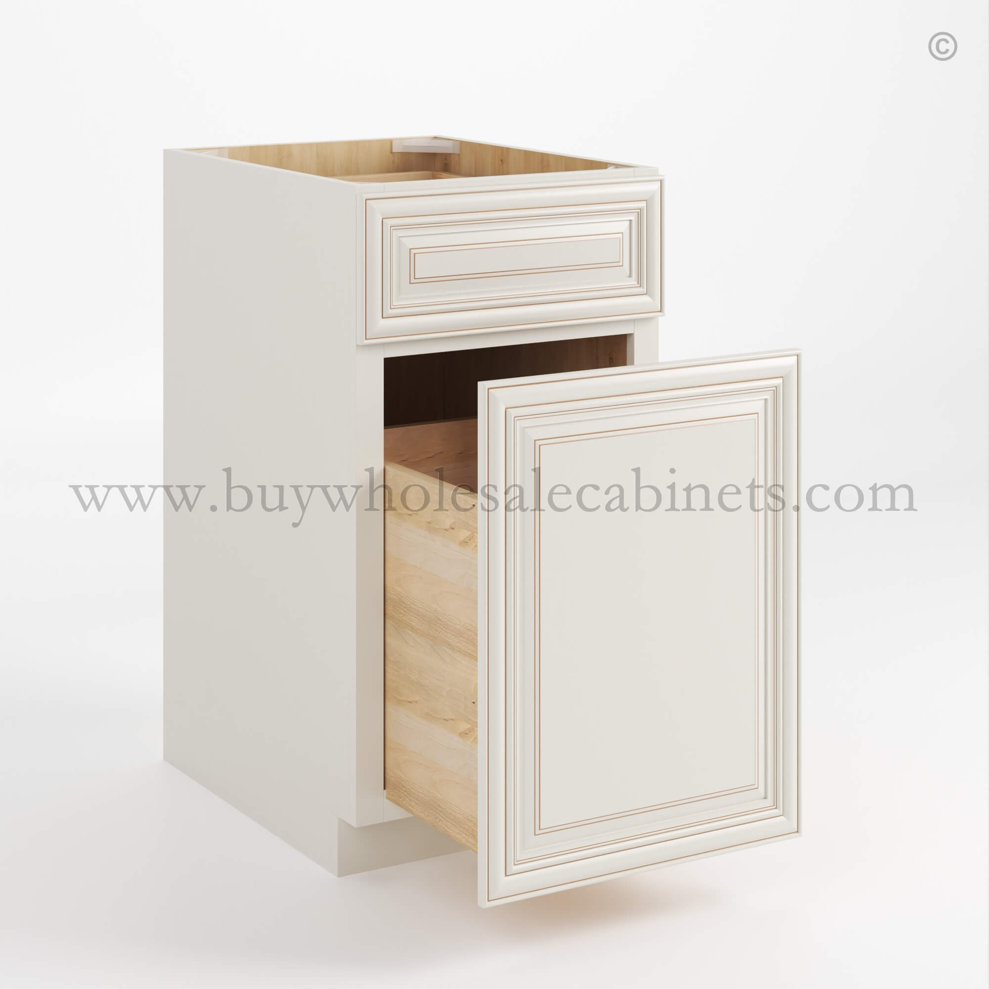 Our Charleston White Raised Panel Trash Base Cabinet is 18″ wide, 34.5″ tall, and 24″ deep.