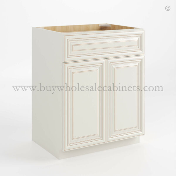 Our Charleston White Raised Panel Double Vanity Sink Base Cabinet is 34.5″ tall, 21″ deep, and available in 2 widths (30″, 36″).