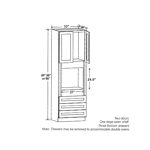 Our Gray Shaker 33 W Oven Pantry Cabinet is 33″ wide, 24″ deep, and available in 3 heights (84″, 90″, 96″).