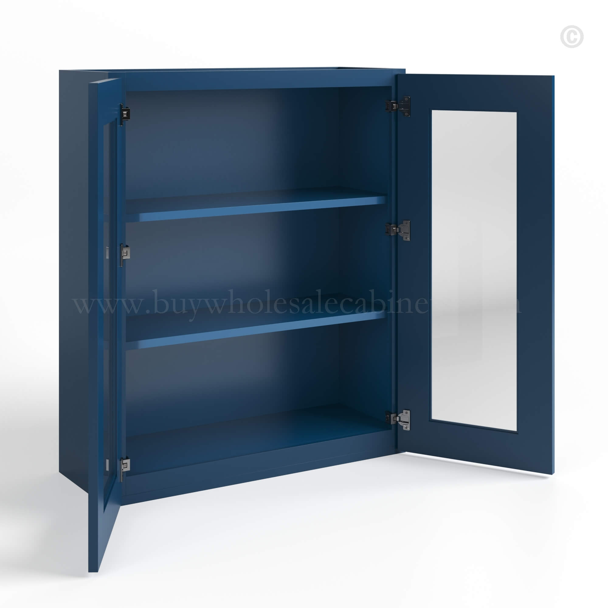Our Navy Blue Shaker 36 H Double Door Wall Cabinet with Glass Doors is 36″ tall, 12″ deep, and available in 2 widths (24″, 30″).