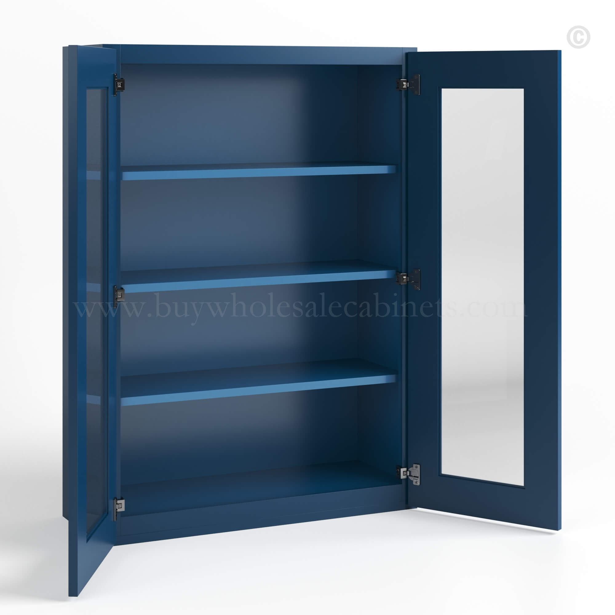 Our Navy Blue Shaker 42 H Double Door Wall Cabinet with Glass Doors is 42″ tall, 12″ deep, and available in 2 widths (24″, 30″).