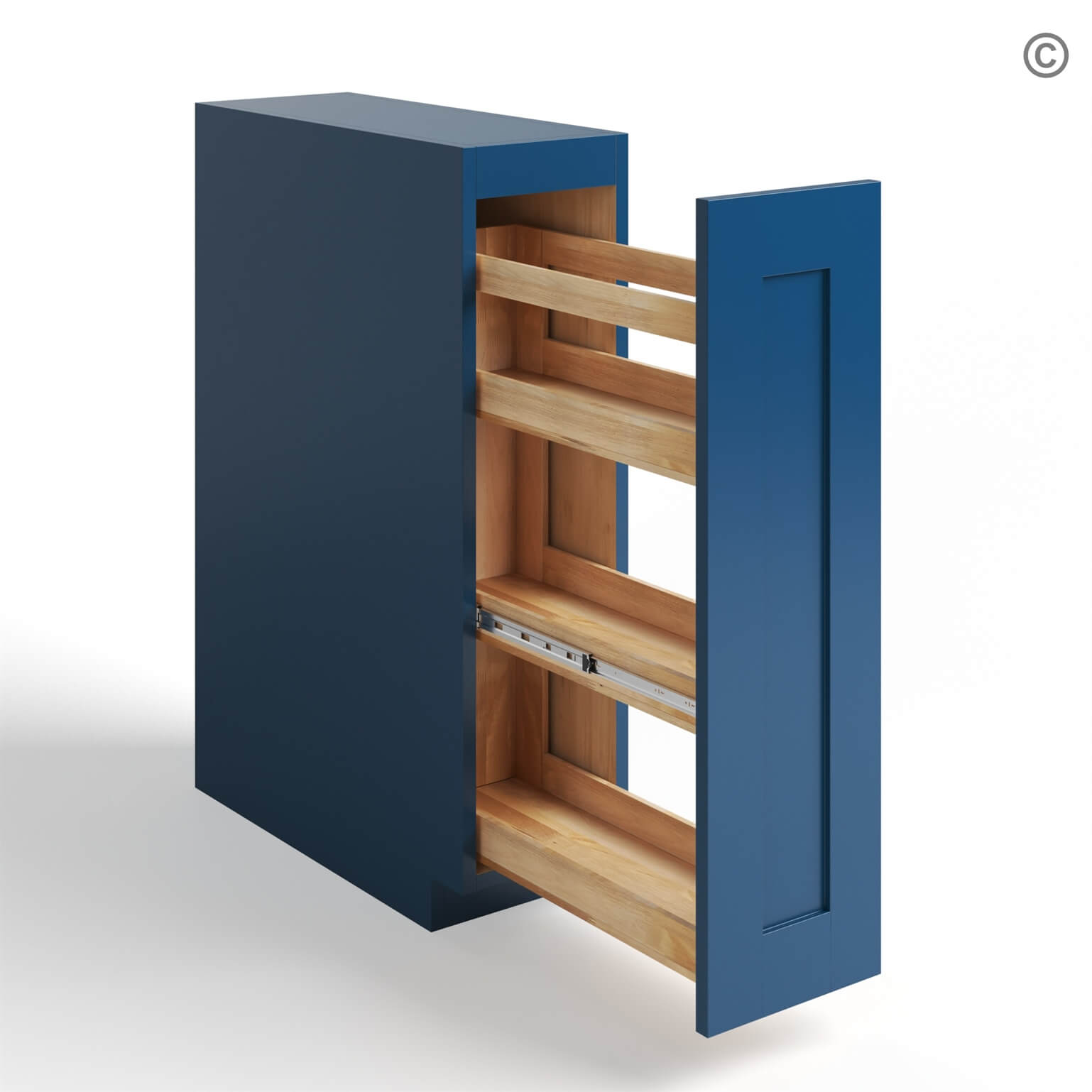 Our Navy Blue Shaker Spice Pull Base Cabinet is 34.5″ tall, 24″ deep, and available in 2 widths (6″, 9″).