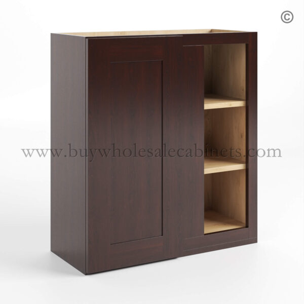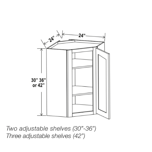 Our Shaker Espresso 24 Diagonal Corner Wall Cabinet is 24″ wide, 12″ deep, and available in 3 heights (30″, 36″, and 42″).