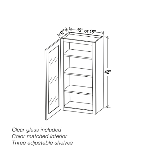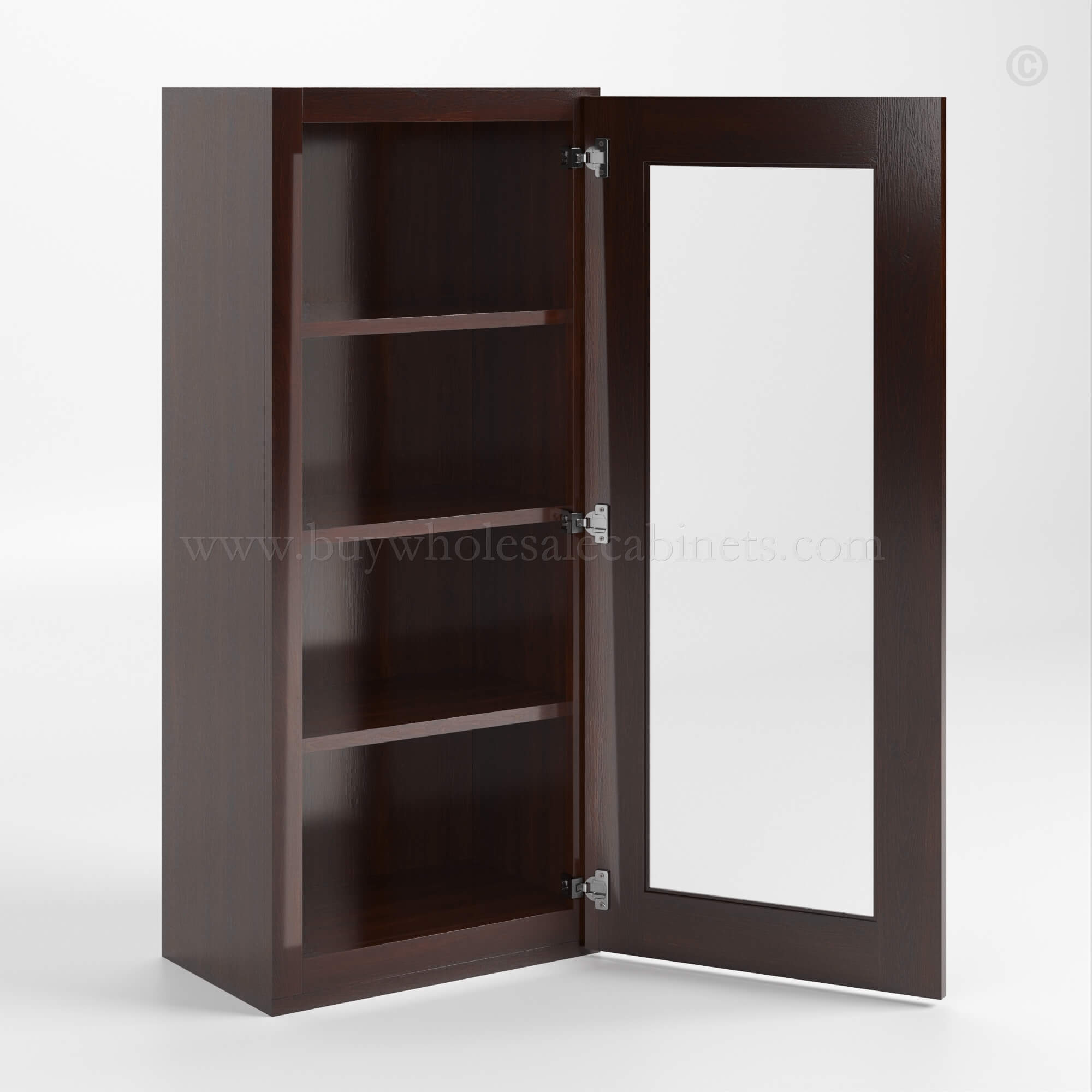 Our Shaker Espresso 42 H Single Door Wall Cabinet with Glass Door is 42″ tall, 12″ deep, and available in 2 widths (15″, 18″).