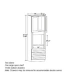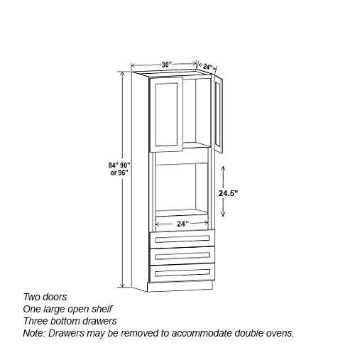 Our Treasure Chest Shaker 30 W Oven Pantry Cabinet is 30″ Wide, 24″ Deep, and available in 3 heights. This cabinet features two doors, one large open shelf, and three bottom drawers. This cabinet Treasure Chest will fit perfectly in your kitchen or bathroom.