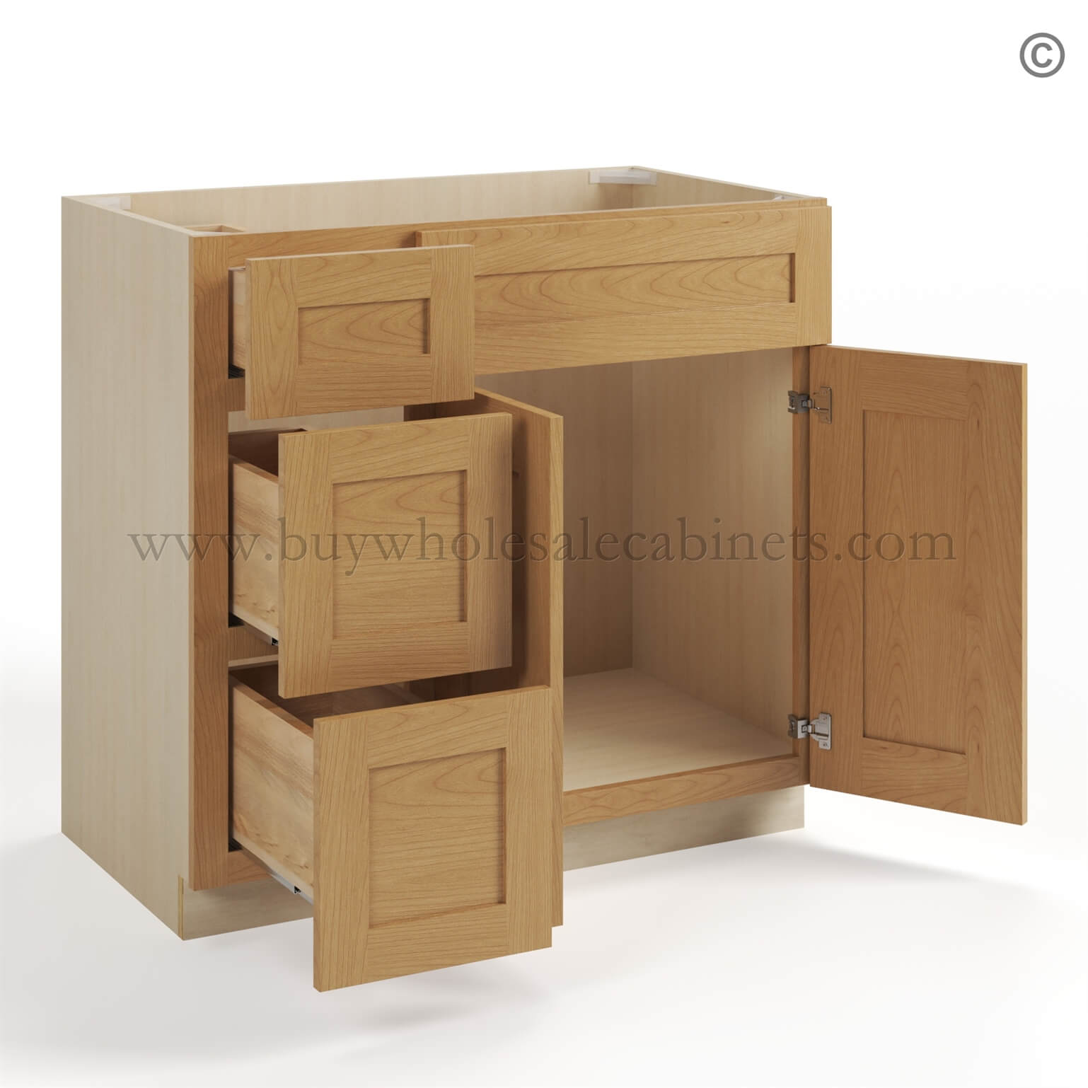 Our Treasure Chest Shaker 36 W Vanity Combo Drawer with Drawers is 34.5″ Tall, 21″ Deep, and 36″ Wide. This cabinet features 3 drawers and is available with drawers on the right or left side.