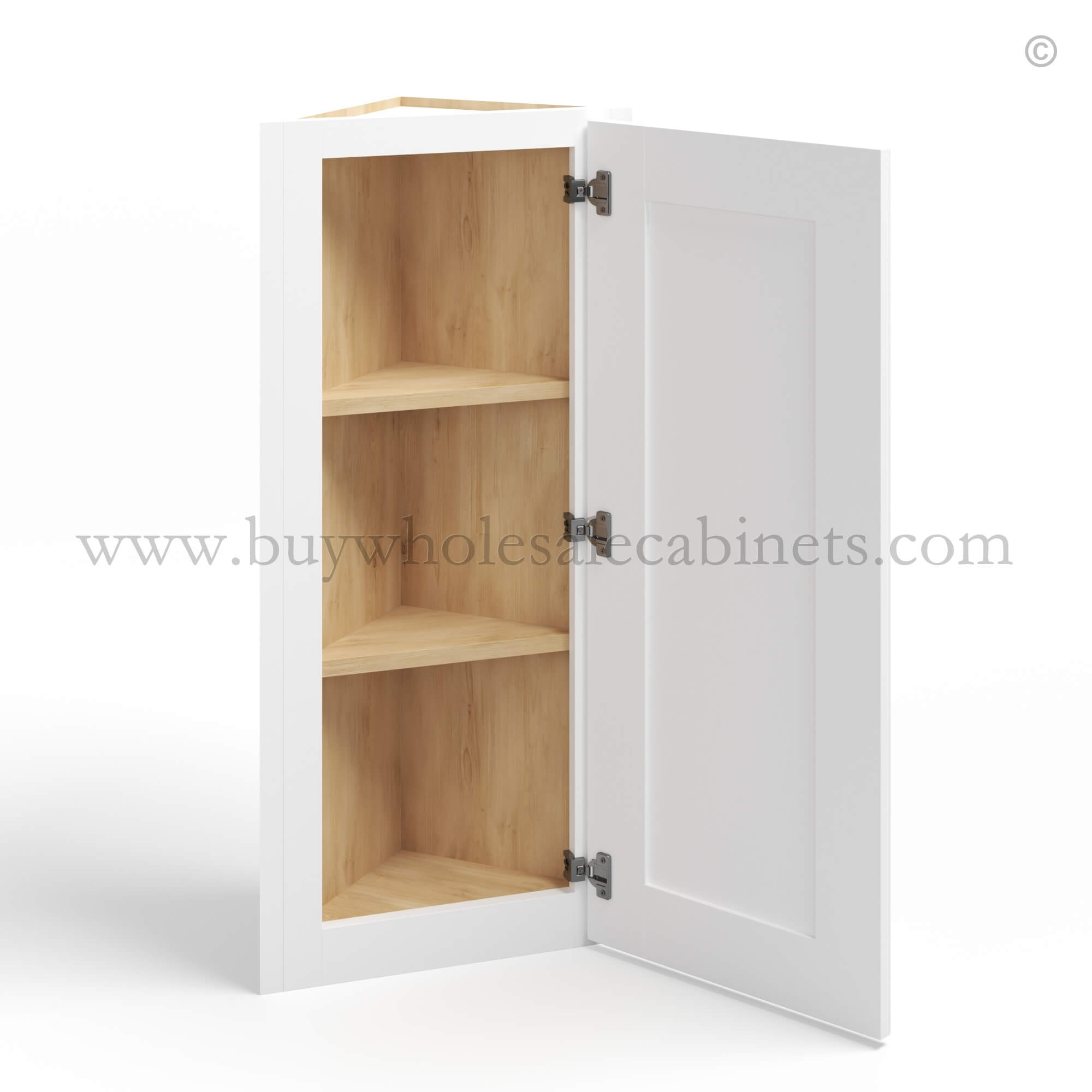 Our White Shaker 12 W Angle Wall Cabinet is 12″ wide 12″ deep, and available in 3 different heights. (30″, 36″, 42″).