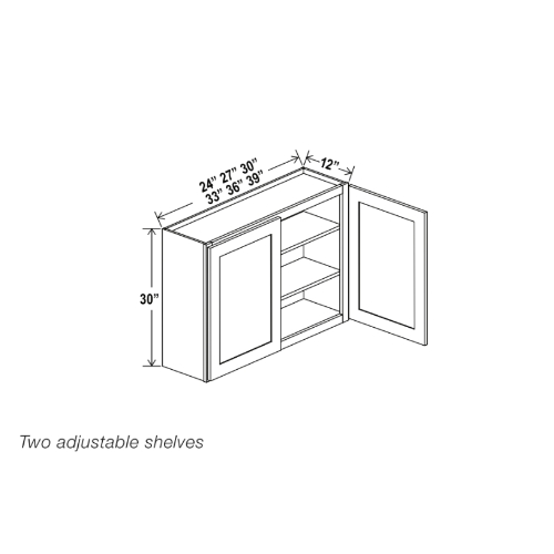 Our White Shaker 30 H Double Door Wall Cabinet is 30″ tall, 12″ deep, and available in 6 widths (24″, 27″, 30″, 33″, 36″, 39″).
