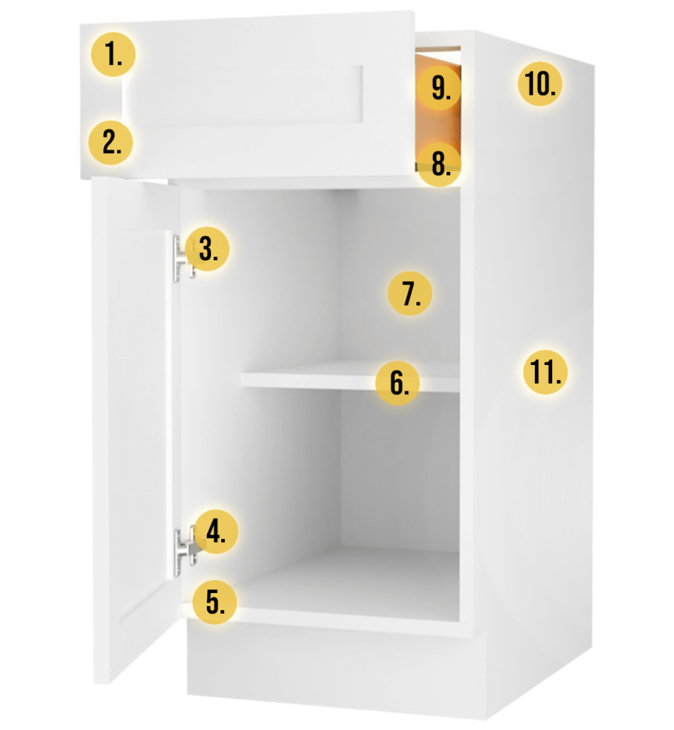 All base cabinets in this product line are provided without toe kicks. Coordinating toe kicks can be purchased in the Accessories section and are required for this cabinet line.